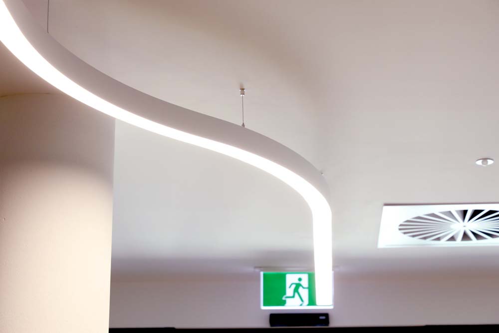 Originally, the lighting scheme was based largely around troffers. During the design process, this evolved into a bold curved linear concept using Novon’s OrganiX range, creating long flowing lines of light throughout key areas of the building.